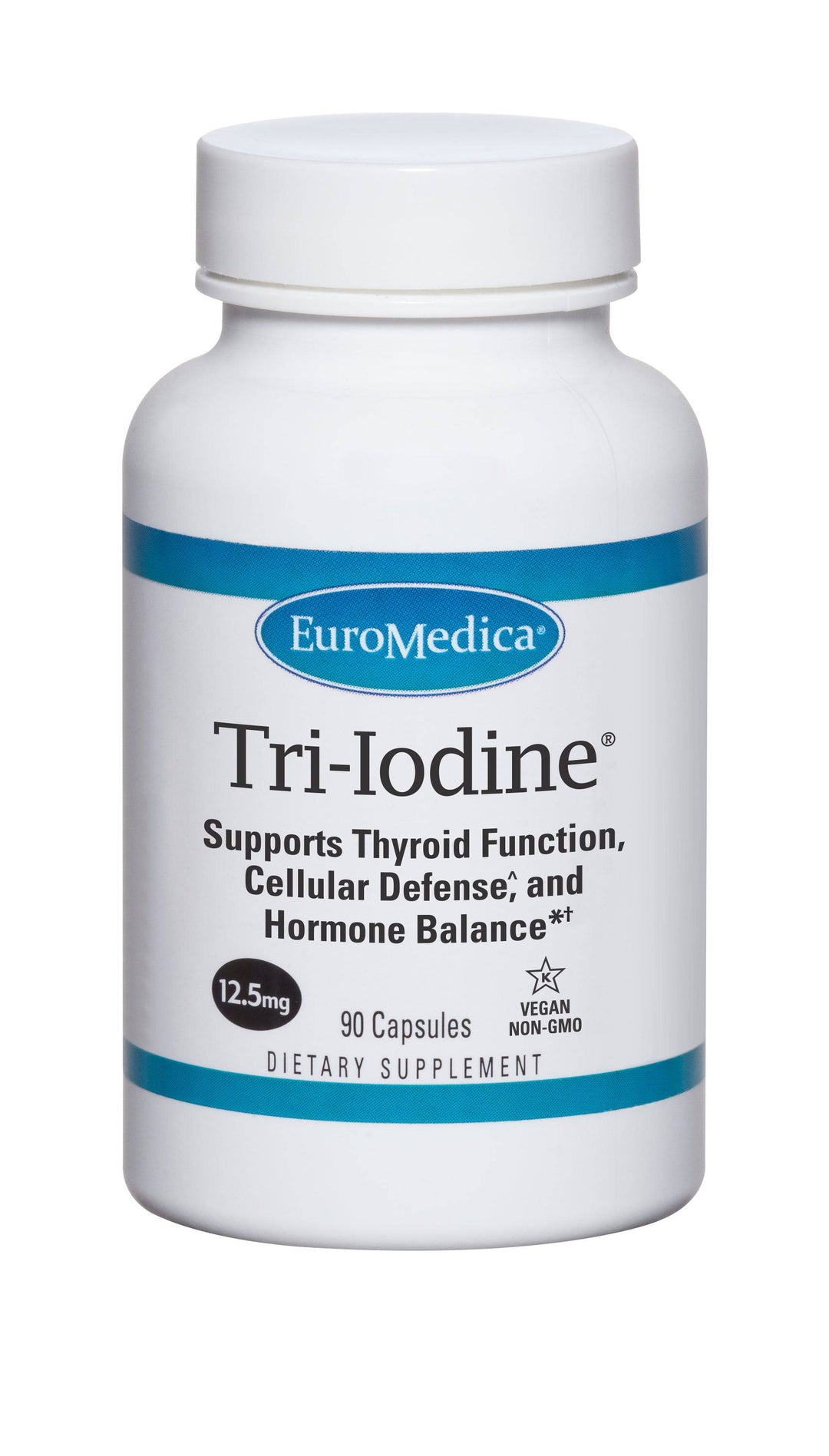 Tri-Iodine® provides three beneficial forms of iodine, an essential element. Available in two strengths for targeted supplementation: 6.25 mg total iodine (equivalent to 6,250 mcg), and 12.5 mg total iodine (equivalent to 12,500 mcg) per capsule. Optimal levels of iodine are imperative to many systems in the body including:
