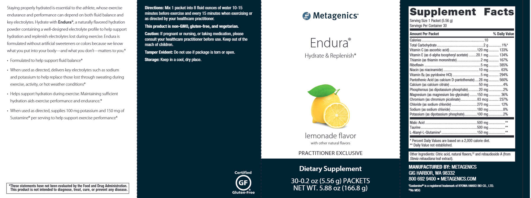 Staying properly hydrated is essential to the athlete, whose exercise endurance and performance can depend on both fluid balance and key electrolytes. Hydrate with Endura®, a naturally flavored hydration powder containing a well-designed electrolyte profile to help support hydration and replenish electrolytes lost during exercise. Endura is formulated without artificial sweeteners or colors because we know what you put into your body—and what you don't—matters to you.*