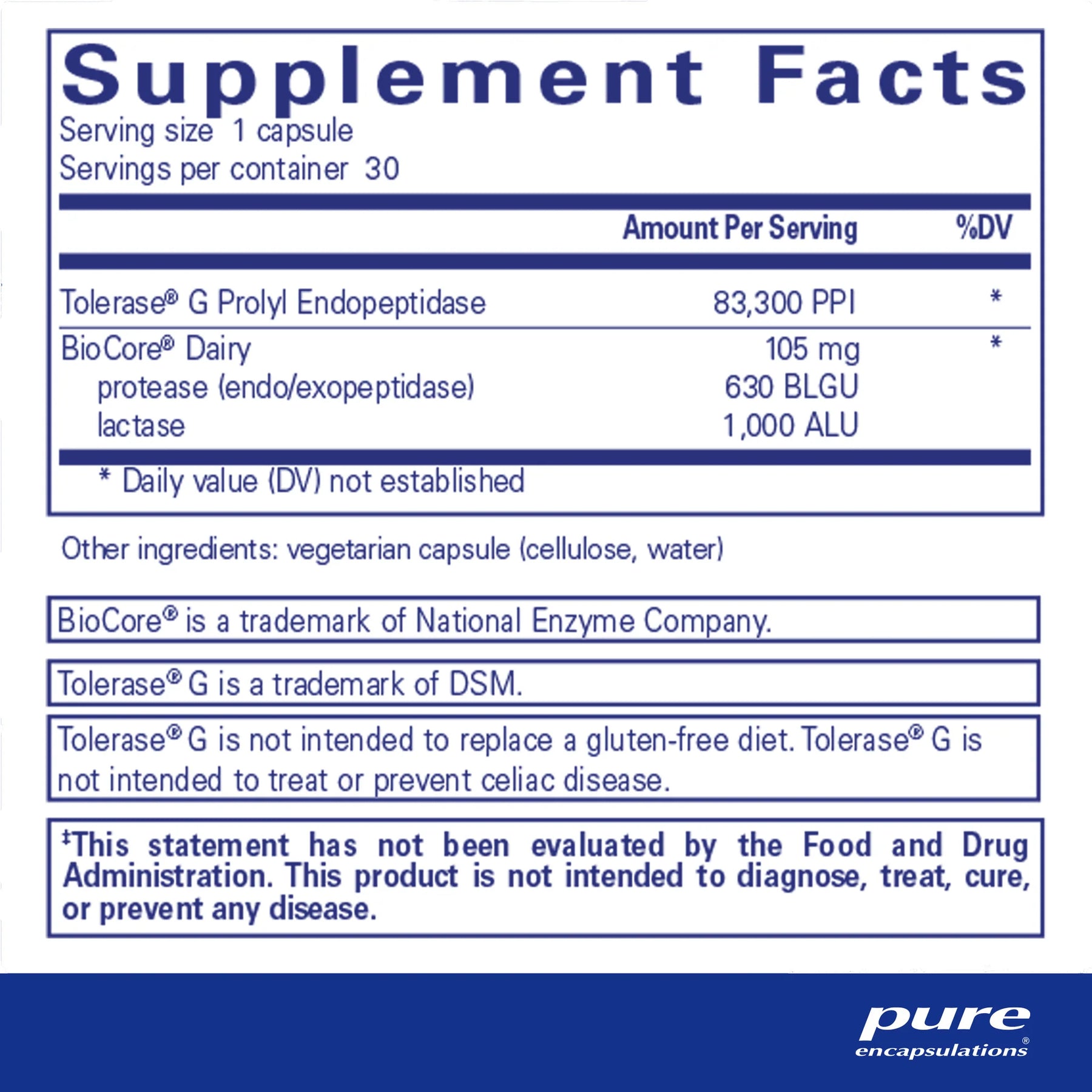 Gluten/Dairy Digest contains a blend of digestive enzymes to support gluten and dairy digestion. It can help break down gluten peptide fragments in normal digestive systems and may support G.I. comfort and function. Additionally, this formula provides a unique mixture of protease enzymes and lactase to assist digestion with milk and dairy products. Gluten/Dairy Digest helps to relieve occasional bloating or gas due to dairy consumption.‡