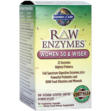 Item Description By Garden of LifeRAW Enzymes Women 50 & Wiser is uniquely formulated to support the digestive needs of women over age 50, with a full spectrum of 22 high-potency RAW enzymes, along with probiotics and RAW food vitamins and minerals. As we age, our digestive systems become less efficient at producing enzymes and other digestive substances such as stomach acid. This formula is designed to help women over 50 digest and absorb the essential nutrients that they need to support optimum health. Garden of Life RAW Enzymes Women 50 & Wiser delivers higher activity per serving of a broader range of enzymes than any other digestive formula.* RAW Enzymes Women 50 & Wiser provides 22 powerful digestive enzymes, with increased carb-digesting enzymes (relative to the other RAW Enzymes formulas), as well as increases proteases in order to meet the needs of women 50+. RAW Enzymes also contains probiotic-created vitamins, minerals and antioxidant enzymes, including glutathione, catalase and SOD along with powerful probiotics that provide added support and act as “enzyme factories”—generating additional enzymes—working overtime for extraordinary digestive health.* Enzymes can support the digestion of dairy, grains, sugars, nuts, seeds, beans, broccoli and cabbage as well as other difficult-to-digest foods. As women age, they tend to experience a drop in stomach acid production which impacts protein digestion. RAW Enzymes Women 50 & Wiser has been specifically formulated to support digestion and overall health needs of women over 50—with amplified strength of carbohydrate-digesting enzymes plus powerful protein-digesting enzymes.* RAW Enzymes Women 50 & Wiser Digestive Health Benefits: • Helps support your body's process difficult-to-digest foods such as dairy, grains, sugars, nuts, seeds, beans, broccoli and cabbage* • Supports colon health and overall digestive function* • Supports gut-related immune system health* • Supports bone health and a healthy metabolism* • Offers pH optimized enzyme support for the entire digestive tract* • RAW Food Vitamins and Minerals • No Binders or Fillers RAW Enzymes Women 50 & Wiser—a whole food, plant-based enzyme formula delivering 22 powerful digestive enzymes specifically formulated to support digestion and overall health needs of women over 50.*LessRAW Enzymes Women 50 & Wiser is uniquely formulated to support the digestive needs of women over age 50, with a full spectrum of 22 high-potency RAW enzymes, along with probiotics and RAW food vitamins and minerals. As we age, our digestive systems become less efficient at producing enzymes and other digestive substances such as stomach acid. This formula is designed to help women over 50 digest and absorb the essential nutrients that they need to support optimum health. Garden of Life RAW Enzymes Women 50 & Wiser delivers higher activity per serving of a broader range of enzymes than any other digestive formula.* RAW Enzymes Women 50 & Wiser provides 22 powerful digestive enzymes, with increased carb-digesting enzymes (relative to the other RAW Enzymes formulas), as well as increases proteases in order to meet the needs of women 50+. RAW Enzymes also contains probiotic-created vitamins, minerals and antioxidant enzymes, including glutathione, catalase and SOD along with powerful probiotics that provide added support and act as “enzyme factories”—generating additional enzymes—working overtime for extraordinary digestive health.* Enzymes can support the digestion of dairy, grains, sugars, nuts, seeds, beans, broccoli and cabbage as well as other difficult-to-digest foods. As women age, they tend to experience a drop in stomach acid production which impacts protein digestion. RAW Enzymes Women 50 & Wiser has been specifically formulated to support digestion and overall health needs of women over 50—with amplified strength of carbohydrate-digesting enzymes plus powerful protein-digesting enzymes.* RAW Enzymes Women 50 & Wiser Digestive Health Benefits: • Helps support your body's process difficult-to-digest foods such as dairy, grains, sugars, nuts, seeds, beans, broccoli and cabbage* • Supports colon health and overall digestive function* • Supports gut-related immune system health* • Supports bone health and a healthy metabolism* • Offers pH optimized enzyme support for the entire digestive tract* • RAW Food Vitamins and Minerals • No Binders or Fillers RAW Enzymes Women 50 & Wiser—a whole food, plant-based enzyme formula delivering 22 powerful digestive enzymes specifically formulated to support digestion and overall health needs of women over 50.*